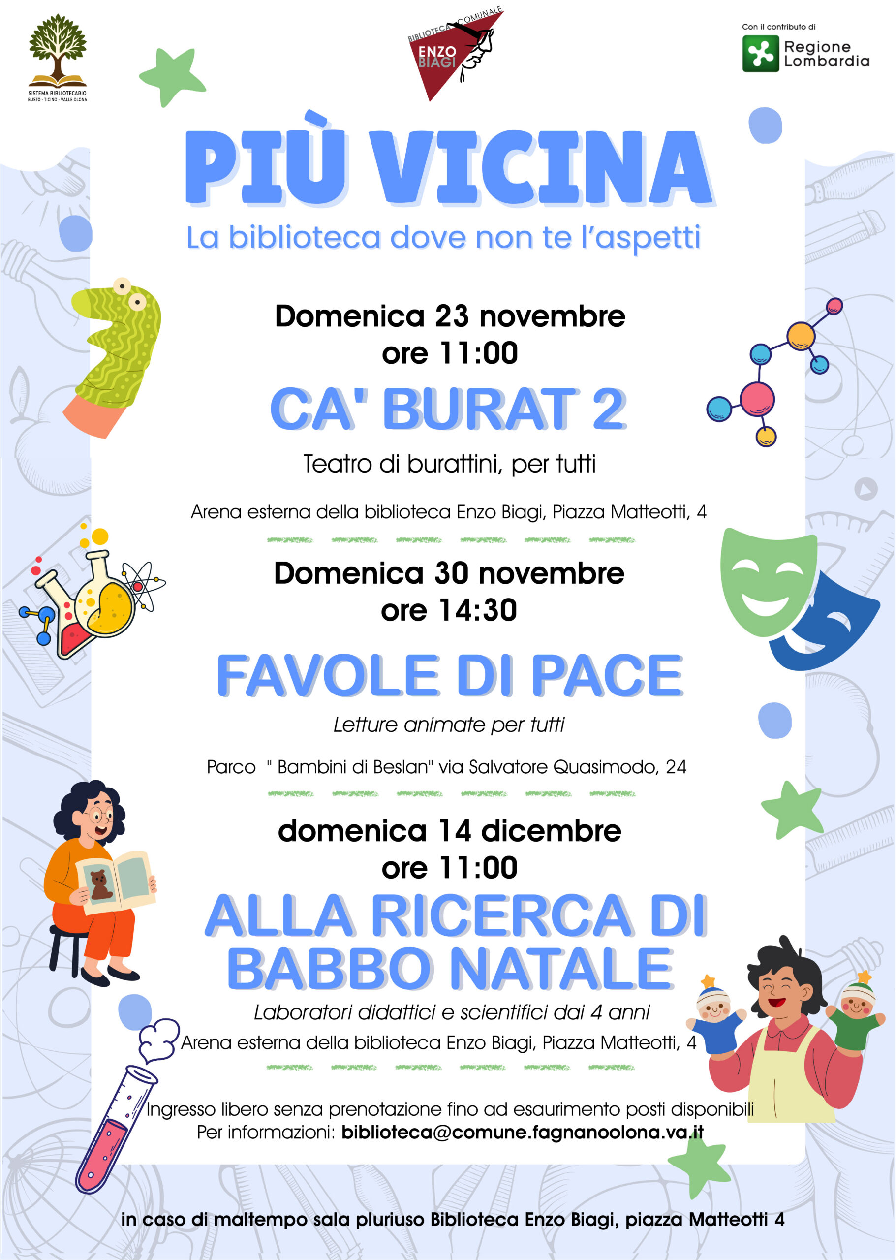 In collaborazione con il sistema bibliotecario Busto Arsizio-Ticino-Valle Olona, per tre domeniche la biblioteca comunale “Enzo Biagi” ospiterà una rassegna di spettacoli per bambini.