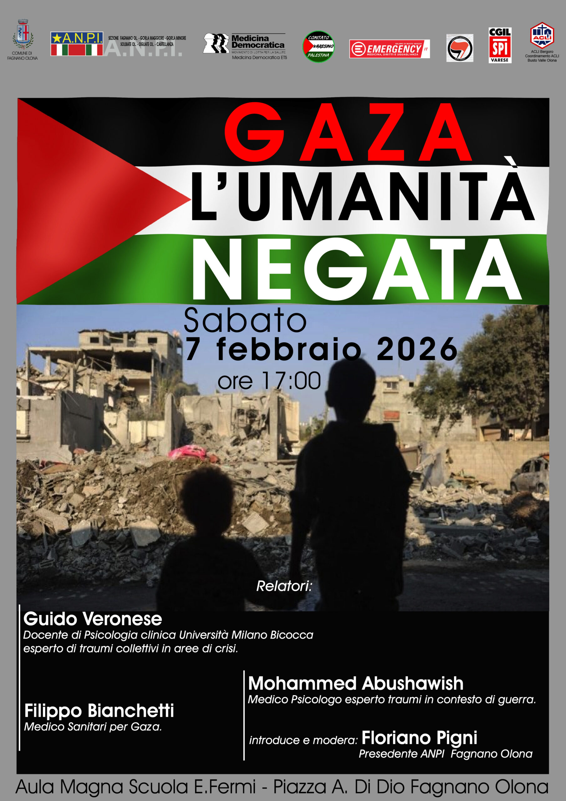 L’Amministrazione Comunale invita tutta la cittadinanza a partecipare all’incontro di approfondimento “Gaza: umanità negata”, che si terrà sabato 7 febbraio alle ore 17:00 presso l’Aula Magna della Scuola “E. Fermi”.