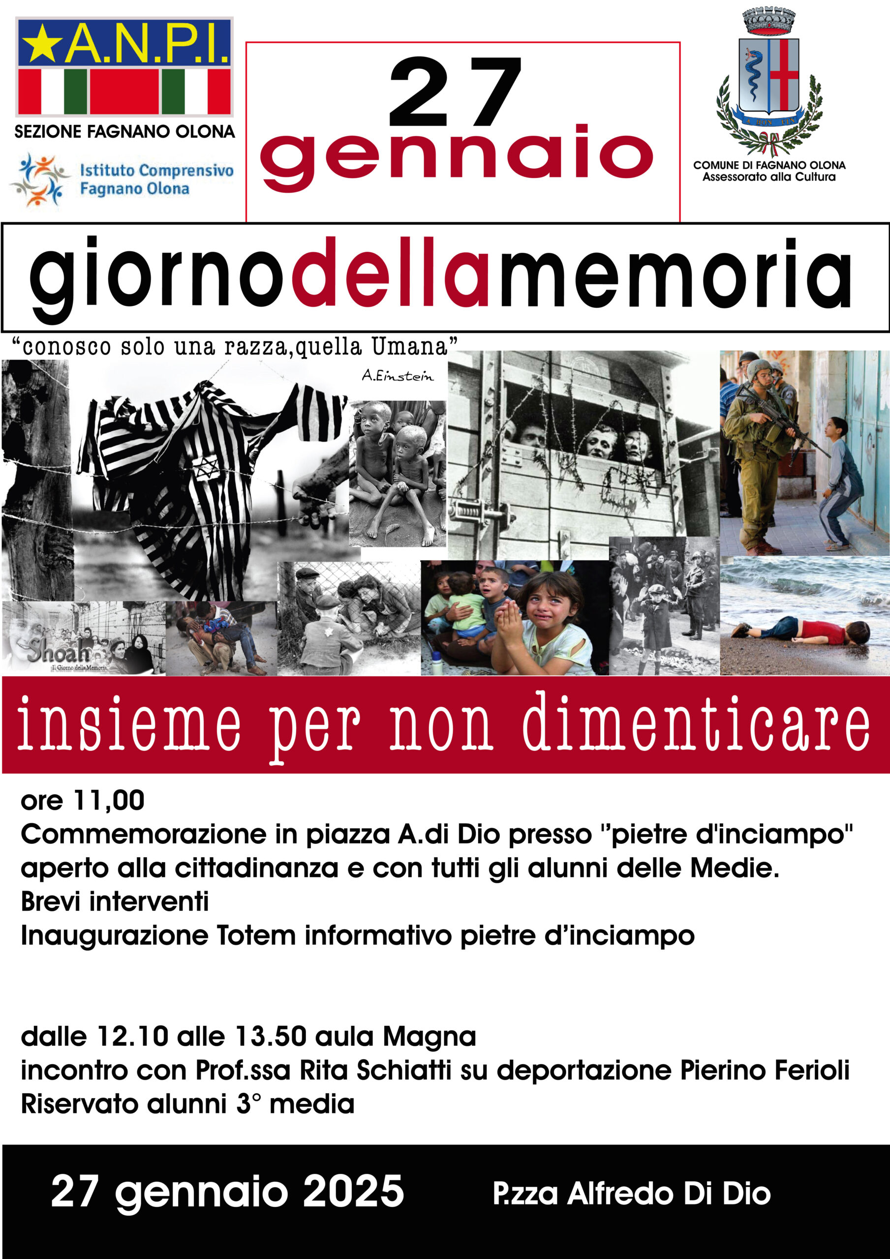 In occasione della ricorrenza del Giorno della Memoria, l’Amministrazione comunale invita la cittadinanza alla cerimonia di commemorazione in programma, a partire dalle ore 11, in Piazza Alfredo Di Dio.